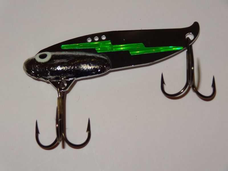 Fishing lure for jigging, trolling or casting with nickel body and green glow scales (die cut). Best walleye lures of all time! Available in  1/2 oz.